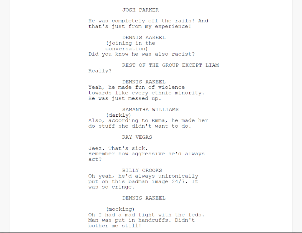 This is a two-page excerpt from my script which depicts former students reminiscing about their past experiences with another character who was known for his racist and sexist behaviour, at their secondary school reunion. There’s tension between characters Dennis Aakeel and Liam Wayne due to Liam’s friendship with that problematic character, who subjected Dennis to abuse. This scene is building up to a confrontation between Dennis and Liam. I made this script because I wanted to tackle the issues of racism and misogyny in the school environment, as these are problems that can be highlighted and challenged through the medium of film.